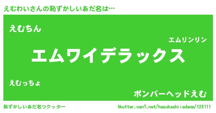 | ヘコむあだ名 | 『えむわい(笑)』『えむぷりん』 |