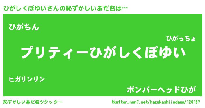 | 女子向けラノベタイトル風あだ名 | 『ひがしくぼゆい姫と円卓の騎士』 |