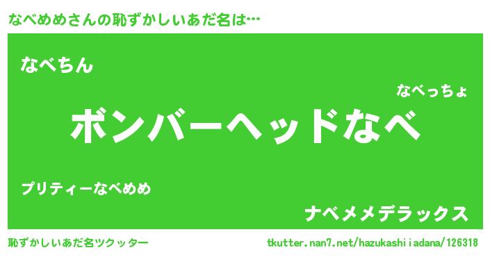 | ヒーロー風カッコイイあだ名 | 『慈愛の使者なべめめ』『ネオナベメメ』 |