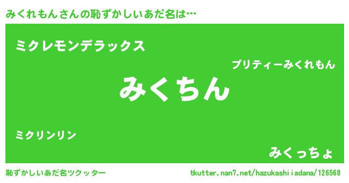 | 意味不明あだ名 | 『永久保存みくれもん』『自称みくれもん』 |