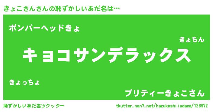 | ヒーロー風カッコイイあだ名 | 『最強戦士キョコサン』『仮面キョダー』 |