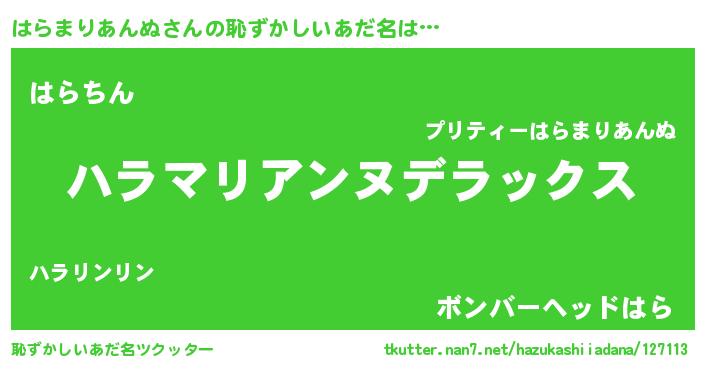 | 女子向けラノベタイトル風あだ名 | 『はらまりあんぬなんてお断りですっ。』 |