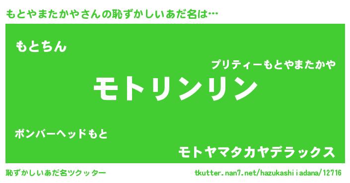 | 男性向けラノベタイトル風あだ名 | 『もとやまたかやの嫁は女の子じゃないと思った?』 |