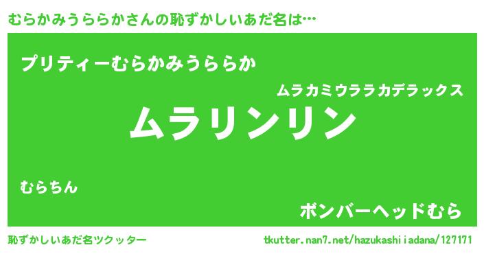 | 男性向けラノベタイトル風あだ名 | 『むらかみうららかの嫁は女の子じゃないと思った?』 |