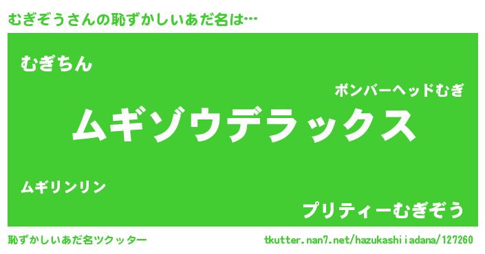 | 男性向けラノベタイトル風あだ名 | 『Re:むぎぞうから始める異世界生活』 |
