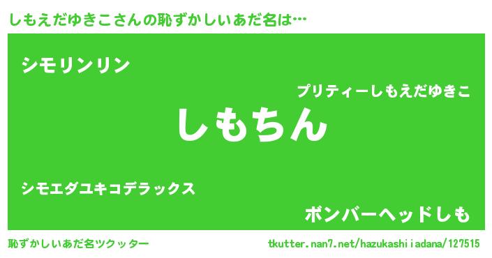 | ヘコむあだ名 | 『しもえだゆきこ(震え声)』『しもっぺ』 |
