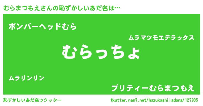 | 男性向けラノベタイトル風あだ名 | 『むらまつもえ~年齢イコール彼女いない歴の魔法使い~』 |