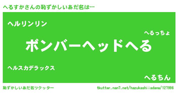 | ヒーロー風カッコイイあだ名 | 『慈愛の使者へるすか』『天弓騎士ヘル』 |