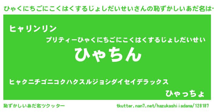 | ヒーロー風カッコイイあだ名 | 『ネオヒャクニチゴニコクハクスルジョシダイセイ』 |