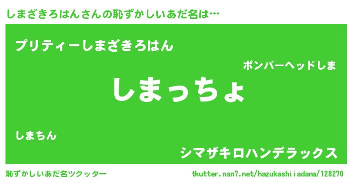| 男性向けラノベタイトル風あだ名 | 『しまざきろはん~年齢イコール彼女いない歴の魔法使い~』 |