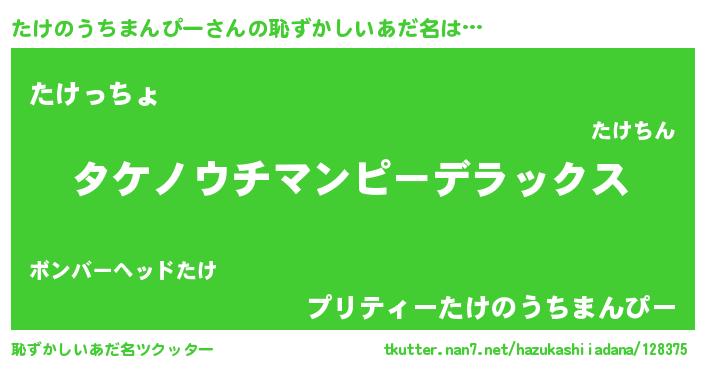 | 男性向けラノベタイトル風あだ名 | 『たけのうちまんぴー~年齢イコール彼女いない歴の魔法使い~』 |
