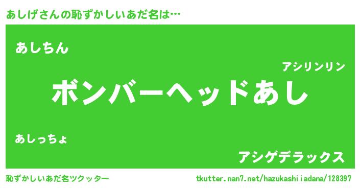 | ヘコむあだ名 | 『あしげ(苦笑)』『あしを』 |