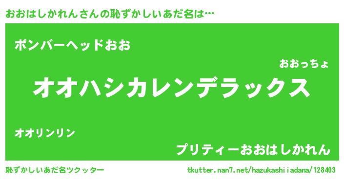 | 意味不明あだ名 | 『自称おおはしかれん』 |