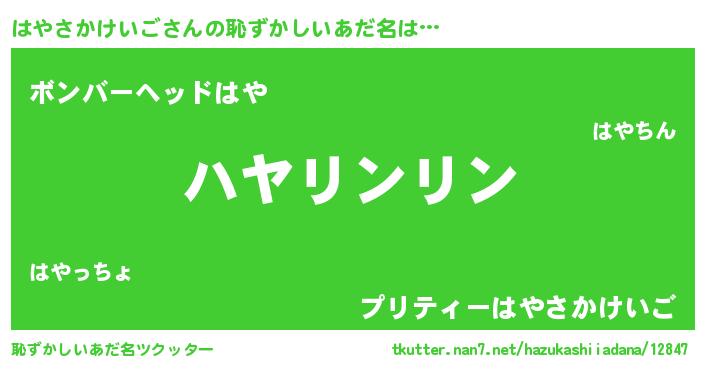 | 男性向けラノベタイトル風あだ名 | 『はやさかけいごの嫁は女の子じゃないと思った?』 |