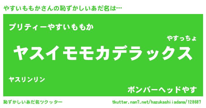 | 男性向けラノベタイトル風あだ名 | 『やすいももか~年齢イコール彼女いない歴の魔法使い~』 |