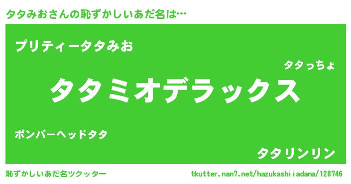 | 男性向けラノベタイトル風あだ名 | 『Re:タタみおから始める異世界生活』 |