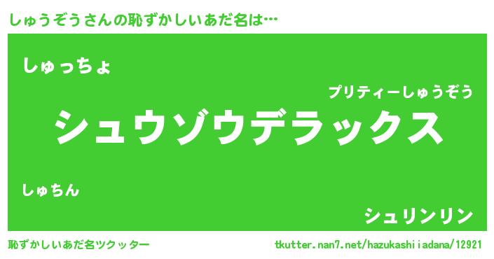 | 男性向けラノベタイトル風あだ名 | 『Re:しゅうぞうから始める異世界生活』 |