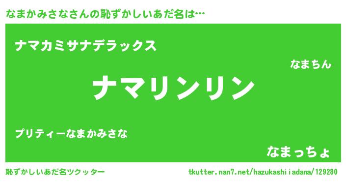 | 男性向けラノベタイトル風あだ名 | 『なまかみさなの嫁は女の子じゃないと思った?』 |
