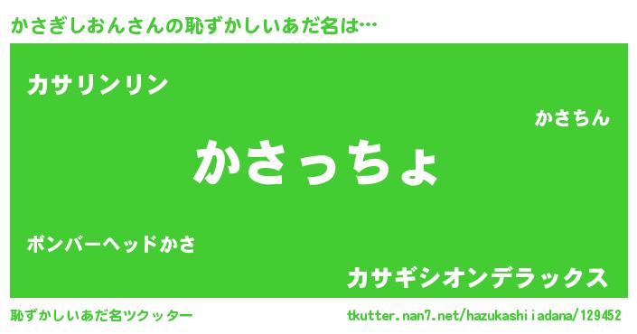 | 男性向けラノベタイトル風あだ名 | 『かさぎしおん~年齢イコール彼女いない歴の魔法使い~』 |