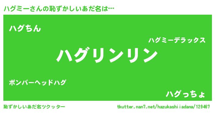 | 男性向けラノベタイトル風あだ名 | 『ハグミーの嫁は女の子じゃないと思った?』 |