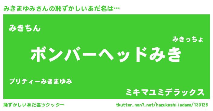 | ヘコむあだ名 | 『みきまゆみ(笑)』『酢こんぶ』 |