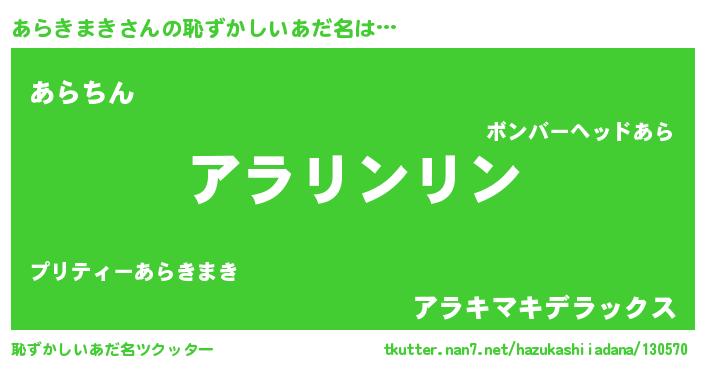 | 男性向けラノベタイトル風あだ名 | 『あらきまきの嫁は女の子じゃないと思った?』 |
