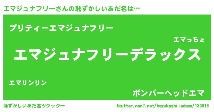 | 男性向けラノベタイトル風あだ名 | 『エマジュナフリー~年齢イコール彼女いない歴の魔法使い~』 |
