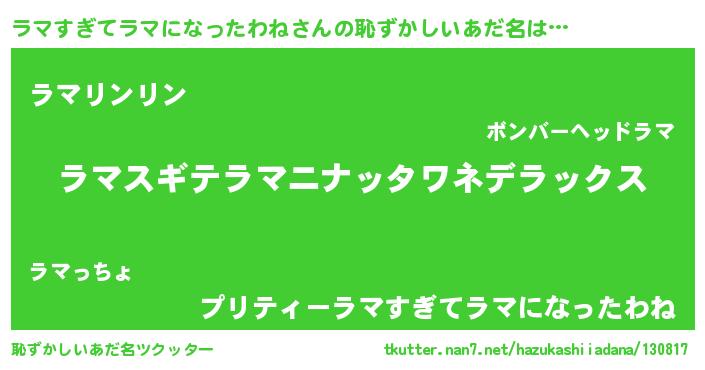 | 料理風あだ名 | 『ラマすぎてラマになったわねのカルパッチョ風』 |