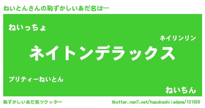 | 男性向けラノベタイトル風あだ名 | 『Re:ねいとんから始める異世界生活』 |