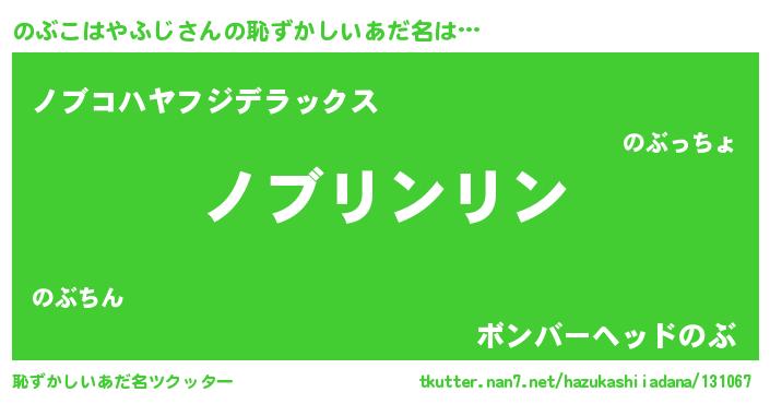 | 男性向けラノベタイトル風あだ名 | 『のぶこはやふじの嫁は女の子じゃないと思った?』 |