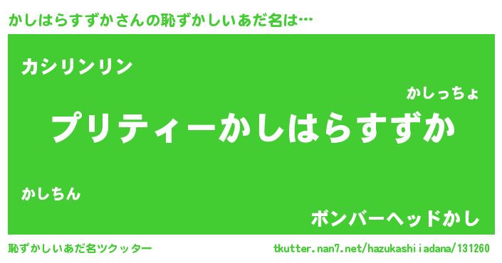 | ヒーロー風カッコイイあだ名 | 『スーパーカシハラスズカ』 |