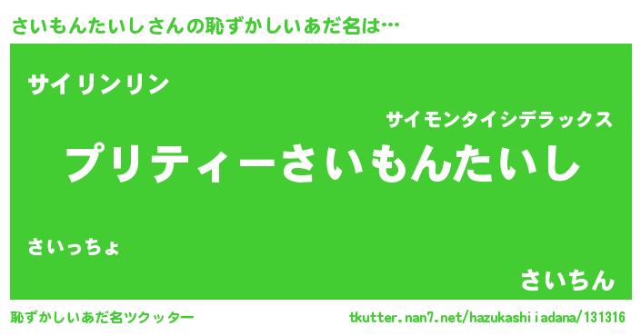 | 男性向けラノベタイトル風あだ名 | 『さいもんたいし~年齢イコール彼女いない歴の魔法使い~』 |