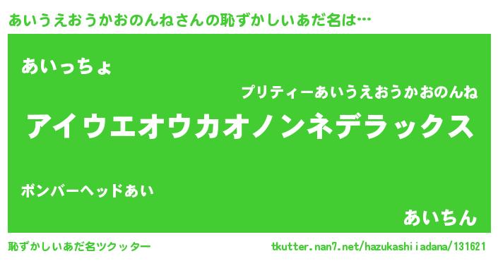 | 男性向けラノベタイトル風あだ名 | 『アイウエオウカオノンネスレイヤー』 |