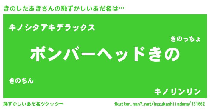| 男性向けラノベタイトル風あだ名 | 『転生したらきのしたあきだった件』 |