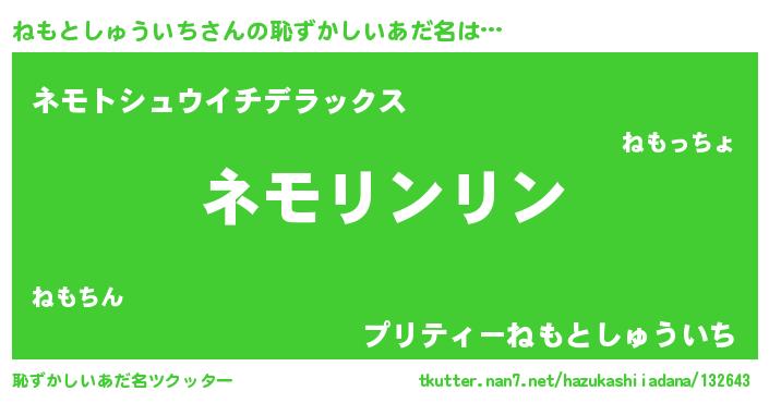| 男性向けラノベタイトル風あだ名 | 『ねもとしゅういちの嫁は女の子じゃないと思った?』 |