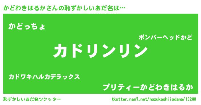 | 男性向けラノベタイトル風あだ名 | 『かどわきはるかの嫁は女の子じゃないと思った?』 |