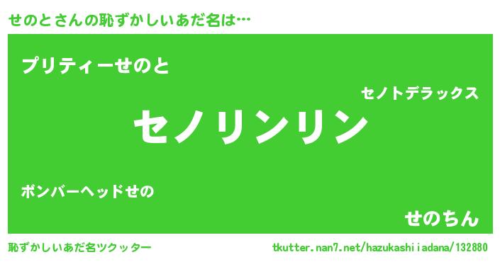 | 男性向けラノベタイトル風あだ名 | 『せのと~年齢イコール彼女いない歴の魔法使い~』 |