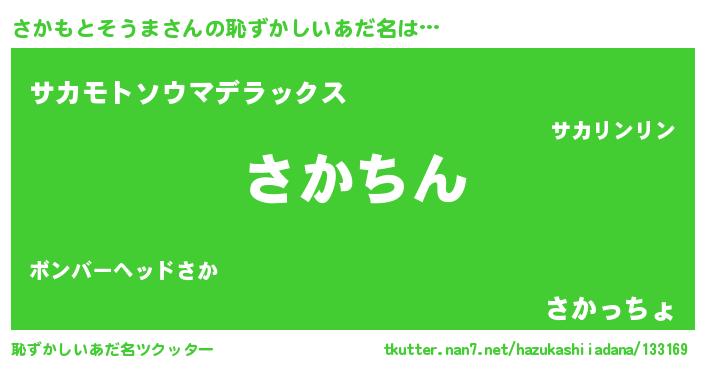 さかもとそうまさんの恥ずかしいあだ名は… 『さかちん』『サカモトソウマデラックス』『さかっちょ』 ツクッター #恥ずかしいあだ名ツクッター http://tkutter.nan7.net/hazukashiiadana/133169/