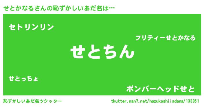 | 男性向けラノベタイトル風あだ名 | 『せとかなるという概念が存在しない退屈な世界 』 |