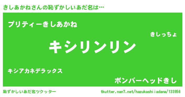 きしあかねさんの恥ずかしいあだ名は… 『キシリンリン』『プリティーきしあかね』『ボンバーヘッドきし』 ツクッター #恥ずかしいあだ名ツクッター http://tkutter.nan7.net/hazukashiiadana/133956/