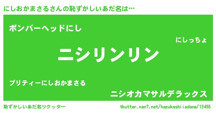 | 男性向けラノベタイトル風あだ名 | 『にしおかまさるの嫁は女の子じゃないと思った?』 |