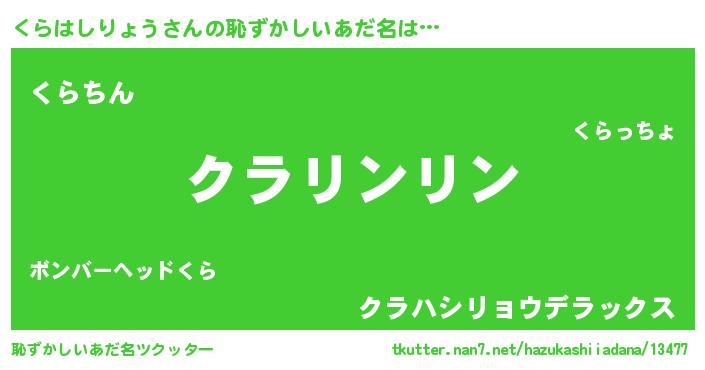 | 意味不明あだ名 | 『とにかく怪しいくらはしりょう』 |