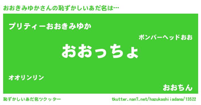 おおきみゆかさんの恥ずかしいあだ名は… 『おおっちょ』『プリティーおおきみゆか』『おおちん』 ツクッター #恥ずかしいあだ名ツクッター http://tkutter.nan7.net/hazukashiiadana/13522/