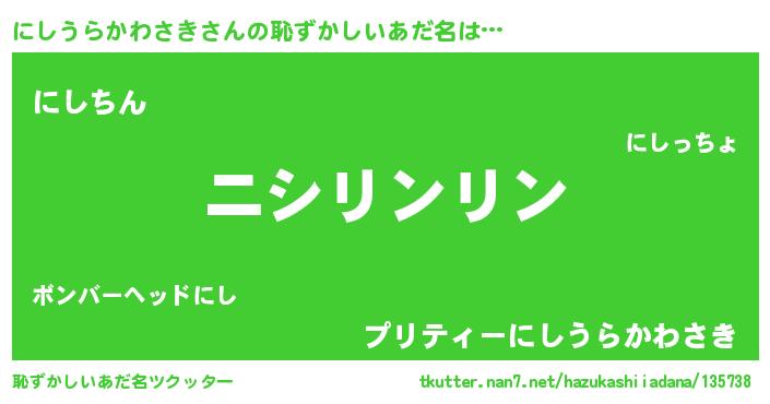 | 可愛いあだ名 | 『にっしぃー』『にしうらかわさきママ』 |
