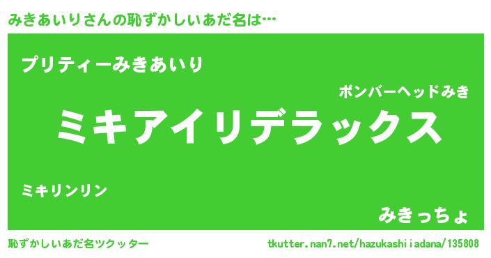 | 意味不明あだ名 | 『自称みきあいり』『ペロリンみきあいり』 |