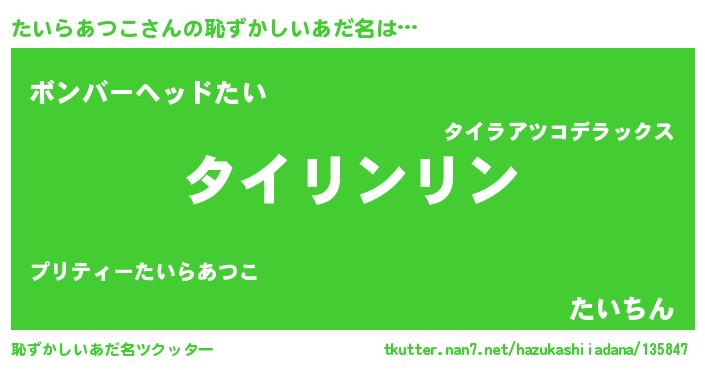 | 意味不明あだ名 | 『とにかく怪しいたいらあつこ』 |