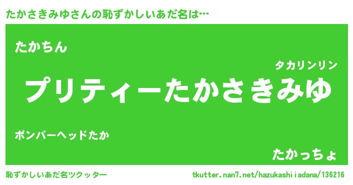 | ヘコむあだ名 | 『たかにゅー』『たかさきみゆ(笑)』 |