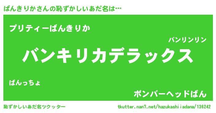 | 肩書あだ名 | 『ばんきりか中将』『ばんきりか閣下』 |
