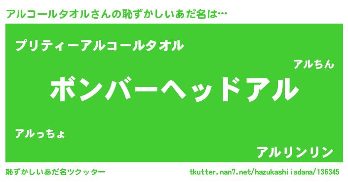 | 女子向けラノベタイトル風あだ名 | 『悪役アルコールタオルに転生したようですが、知った事ではありません』 |