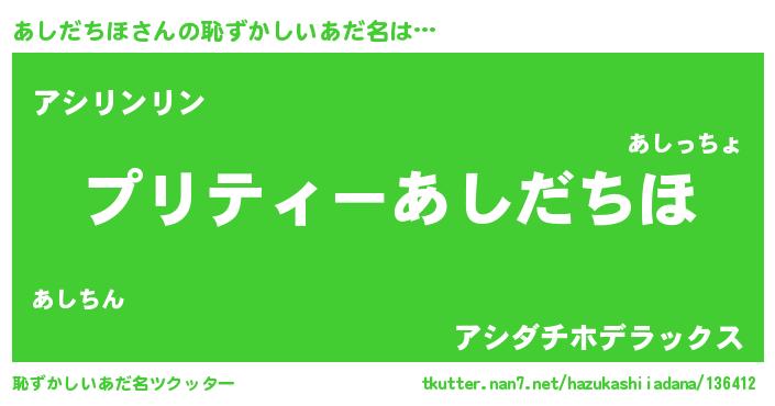 あしだちほさんの恥ずかしいあだ名は… 『プリティーあしだちほ』『アシリンリン』『アシダチホデラックス』 ツクッター #恥ずかしいあだ名ツクッター http://tkutter.nan7.net/hazukashiiadana/136412/